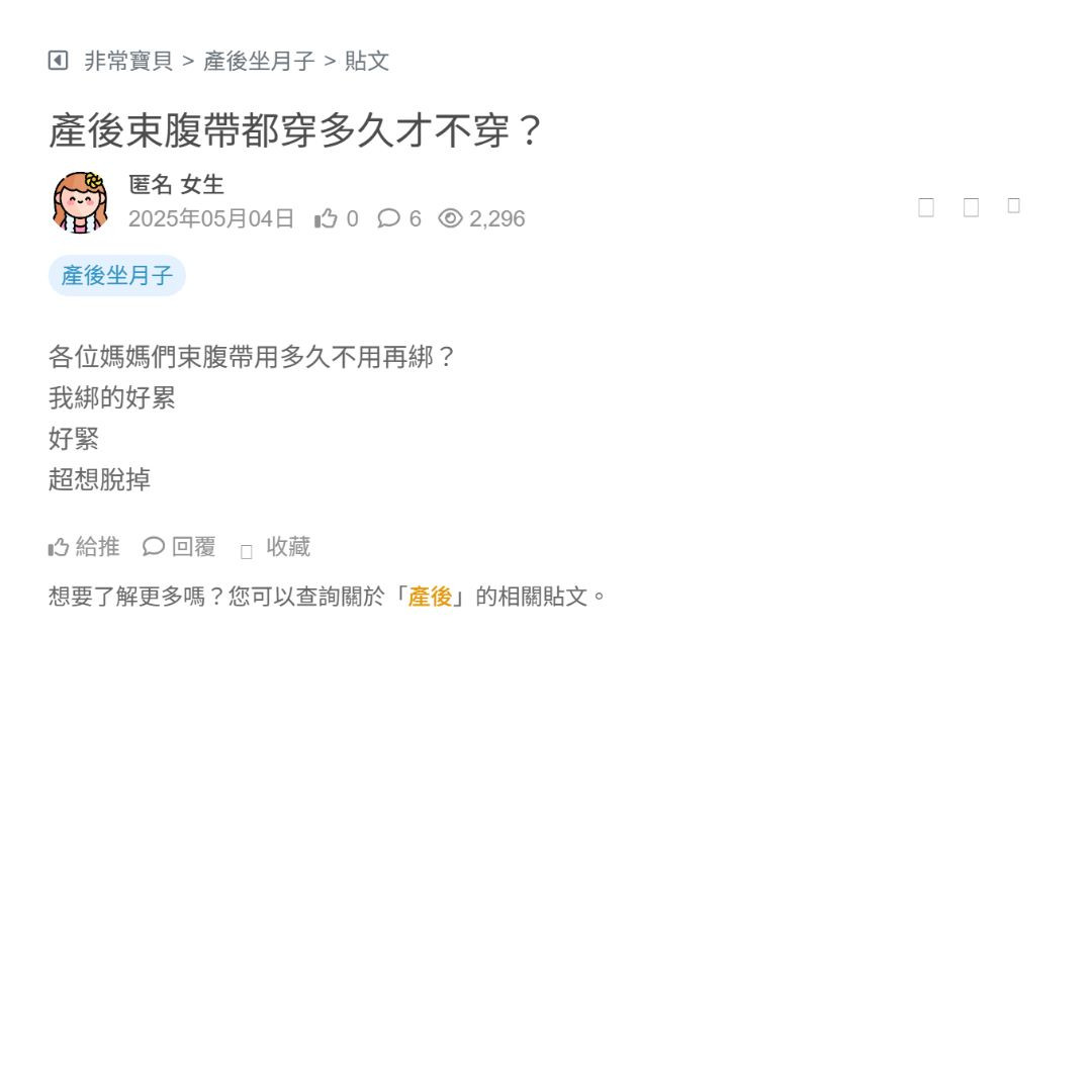 我現在剛生完二週 身邊超多媽媽朋友跟我說一定要穿塑身衣 不然肚子會回不去、腰也會鬆掉 但我待產包清單就沒買 穿塑身衣感覺就不是我的style 很不舒服 尤其餵...