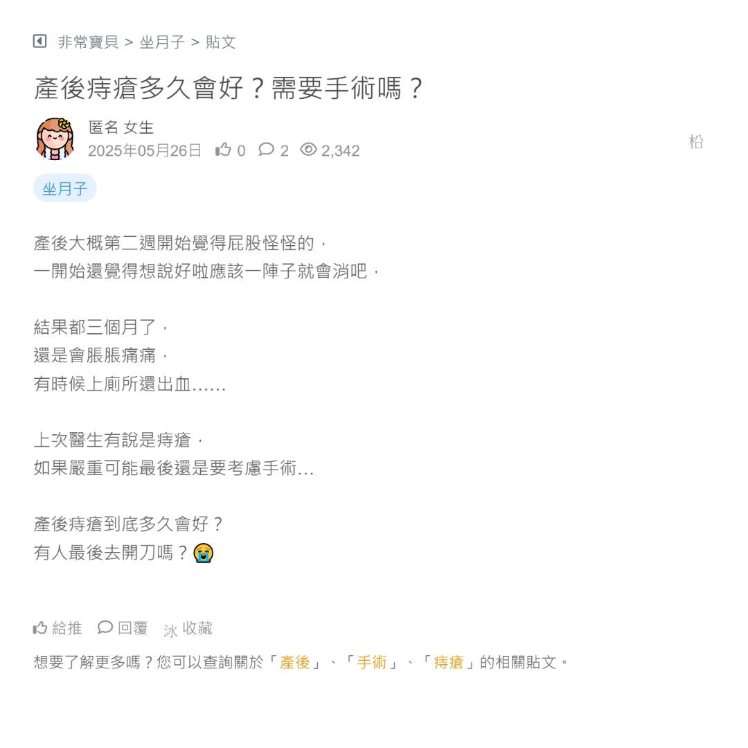 生完產後出現痔瘡 請問各位媽媽痔瘡嚴重到什麼情況要去看醫生手術啊 因為不好意思去看醫生 不知道什麼情況 還有什麼方法可以改善! 手術是最後的選擇 看更多