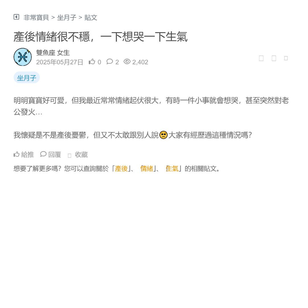剛生完寶寶的媽咪們大家好~ 身邊好生過小孩的朋友都有聊過產後憂鬱 大家講的症狀都不同 想知道我有沒有產後憂鬱 常常想哭算是嗎? 對老公不爽?心中有負面想法是嗎 產後憂鬱是什麼感覺啊 看更多