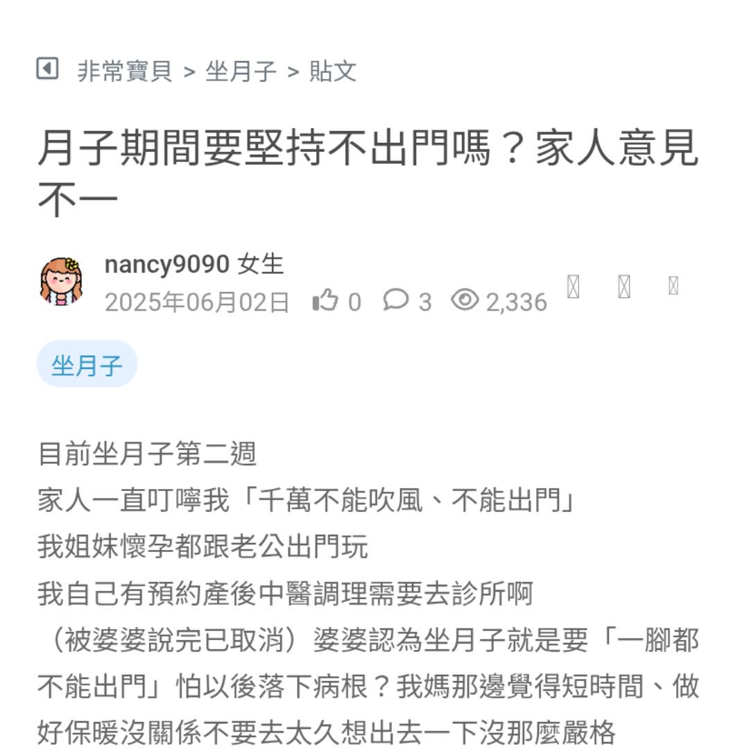 剛生完寶寶,家裡長輩超迷信 一直強調懷孕產後的坐月子很重要 像是不能碰冷水、不能外出、不能吹風、不能洗頭等 有些說得超誇張 我最不能認同的是叫我完全...