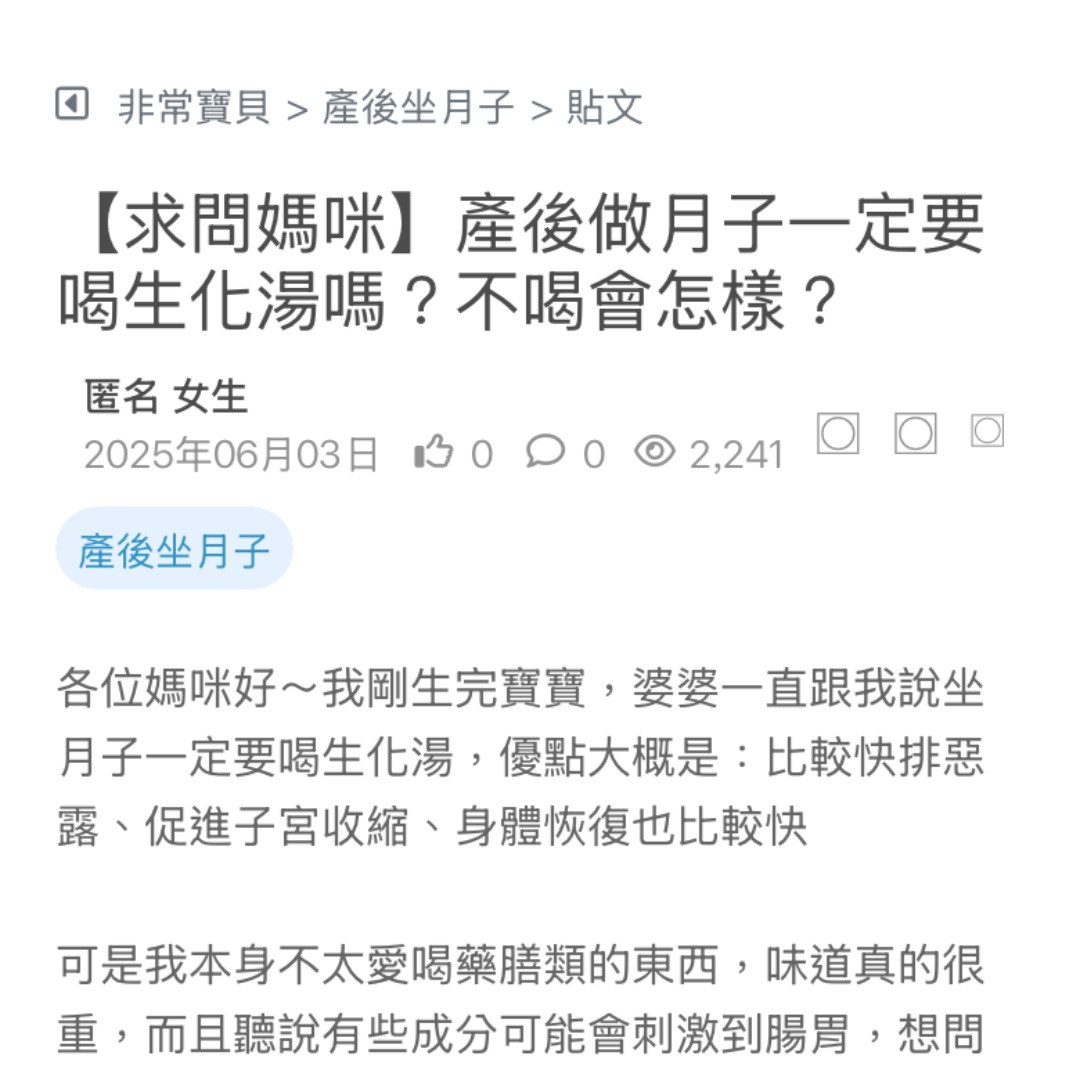 【求問媽咪】產後做月子一定要喝生化湯嗎?不喝會怎樣?