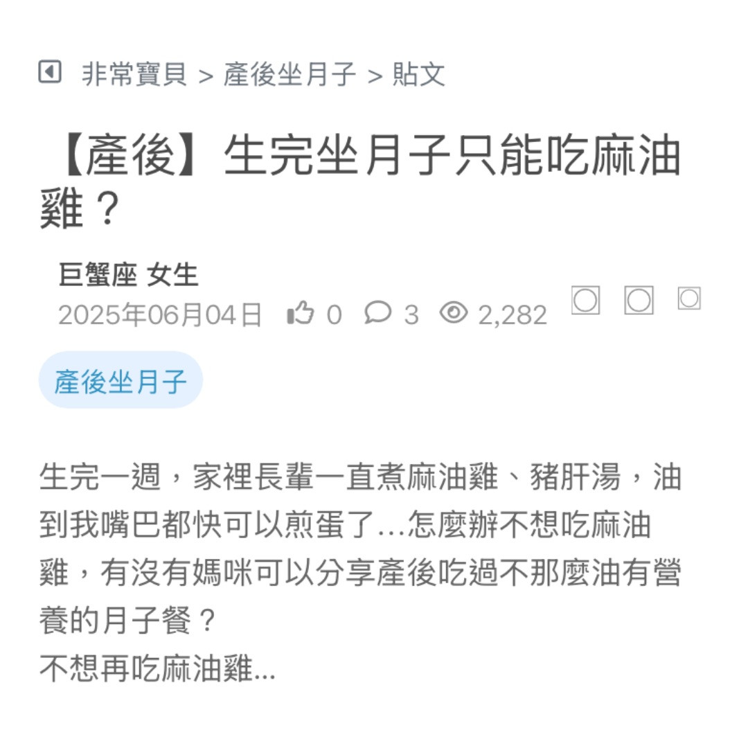 生完一週,家裡長輩一直煮麻油雞、豬肝湯,油到我嘴巴都快可以煎蛋了…怎麼辦不想吃麻油雞,有沒有媽咪可以分享產後吃過不那麼油有營養的月子餐?