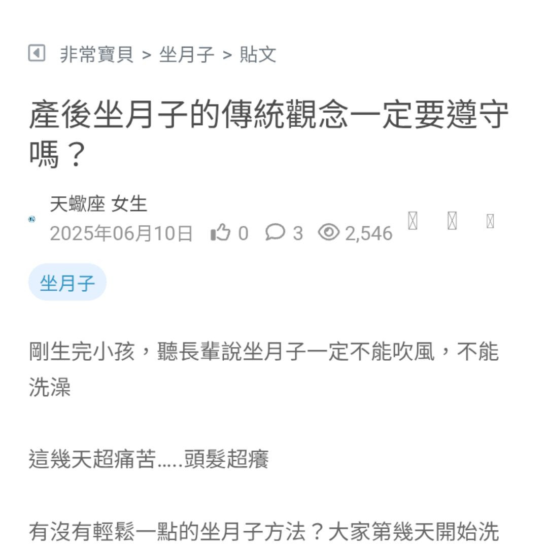 剛生完寶寶,家裡長輩超迷信 一直強調懷孕產後的坐月子很重要 像是不能碰冷水、不能外出、不能吹風、不能洗頭等 有些說得超誇張 我最不能認同的是叫我完全...