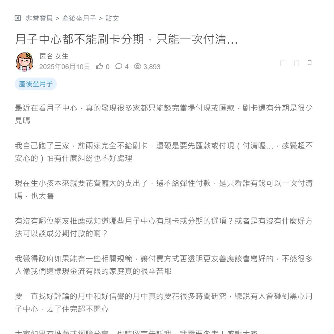 最近在看月子中心,真的發現很多家都只能談完當場付現或匯款,刷卡還有分期是很少見嗎