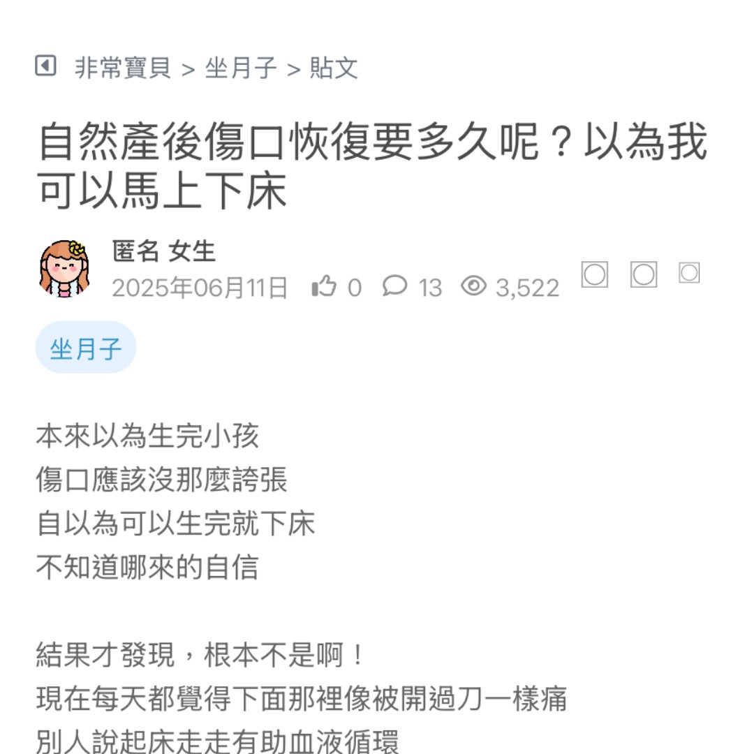 自然產真的比較快復原嗎 我現在有點後悔選剖腹了… 傷口痛到坐也不是、躺也不是 帶小孩根本沒辦法休息 好累喔 看更多
