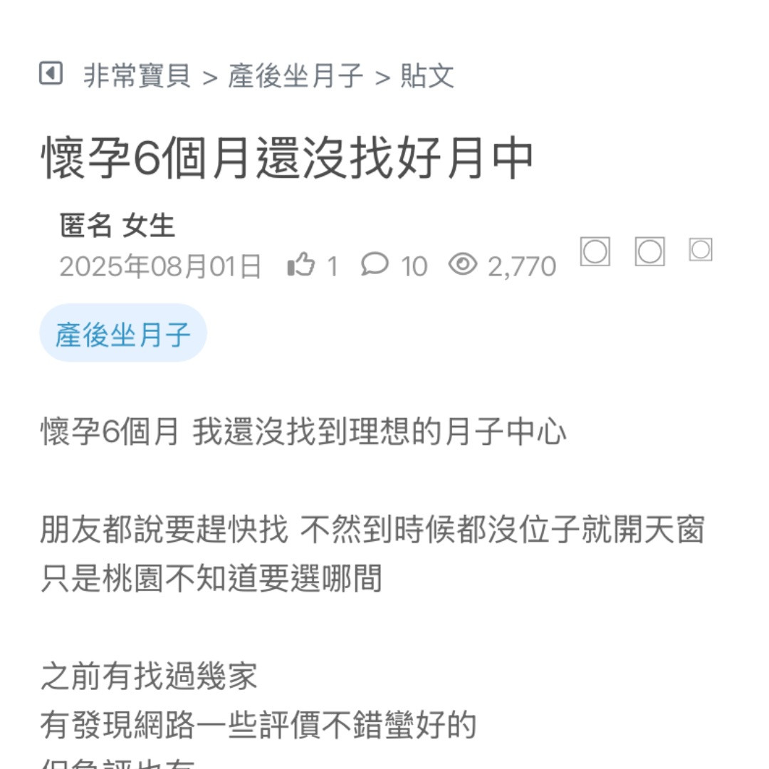 大家好,我預產期是明年3月,最近開始考慮月子中心,但完全不知道該怎麼挑選。 網路上的資訊超多,每一家月子中心看起來都很專業,價格也有高有低。我想問一下...