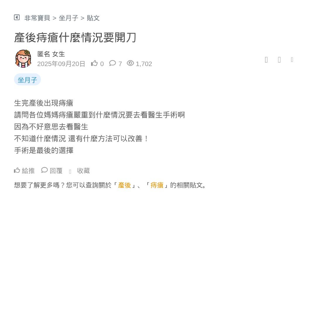 產後大概第二週開始覺得屁股怪怪的, 一開始還覺得想說好啦應該一陣子就會消吧, 結果都三個月了, 還是會脹脹痛痛, 有時候上廁所還出血…… 上次醫生有...