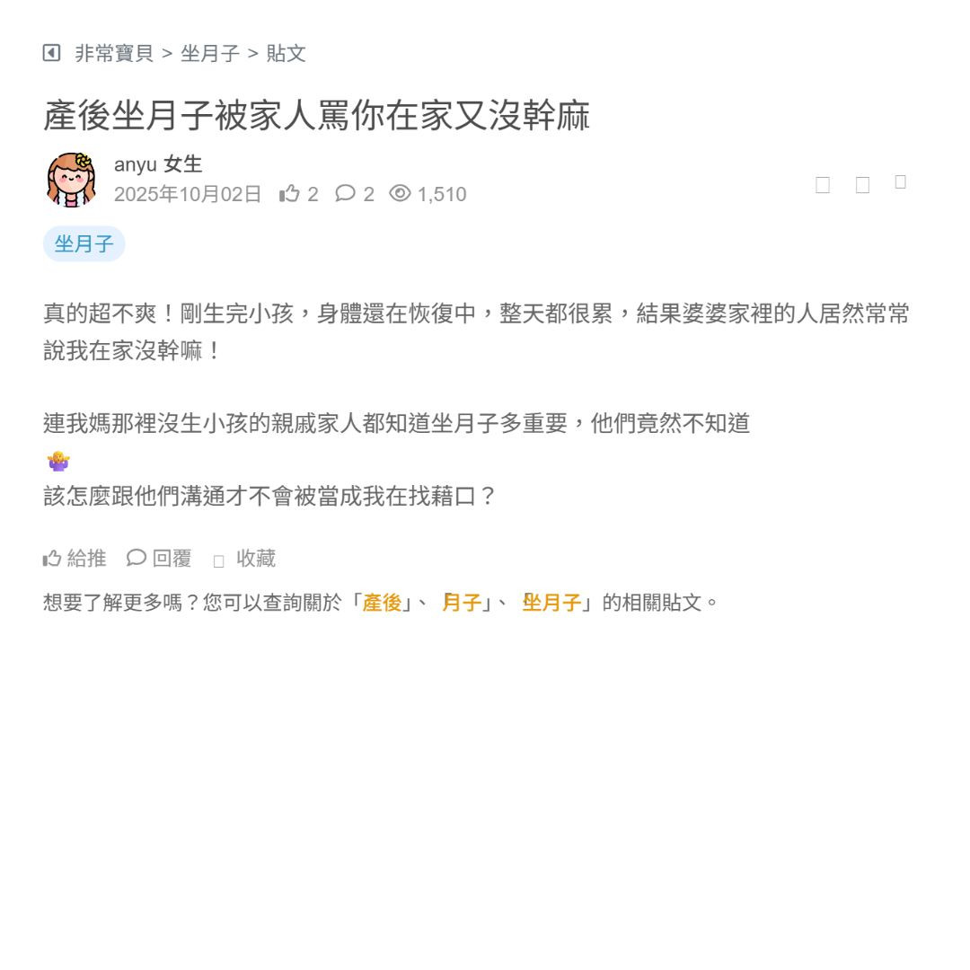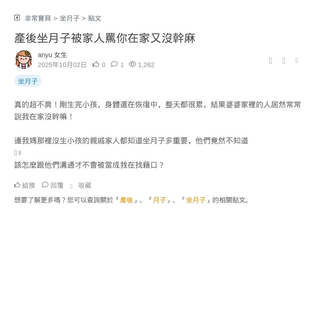 剛生完寶寶,家裡長輩超迷信 一直強調懷孕產後的坐月子很重要 像是不能碰冷水、不能外出、不能吹風、不能洗頭等 有些說得超誇張 我最不能認同的是叫我完全...