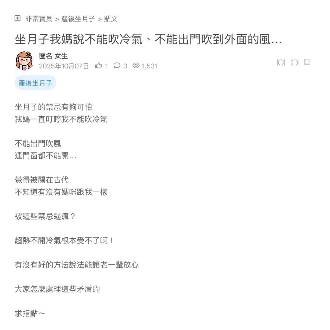 剛生完寶寶,家裡長輩超迷信 一直強調懷孕產後的坐月子很重要 像是不能碰冷水、不能外出、不能吹風、不能洗頭等 有些說得超誇張 我最不能認同的是叫我完全...