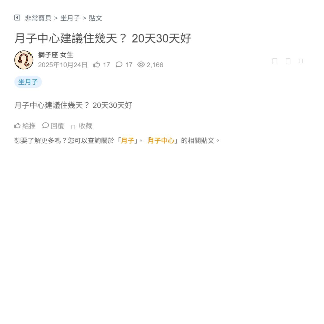 是台北的知名月中 是哪間我就不說了 現在聽到別人問我月子中心住幾天 我會馬上發火... 回到正題: 最近準備當媽媽了 開始安排坐月子的事情 經過朋友的推薦台北某家知名月中 我決定挑選那間月子中心 我一開始問的是21天的方案 畢竟我媽可以幫忙帶 剛生完小孩也沒辦法待太久 21天對我來說剛剛好 結果當我詢問業務關於這個... 看更多