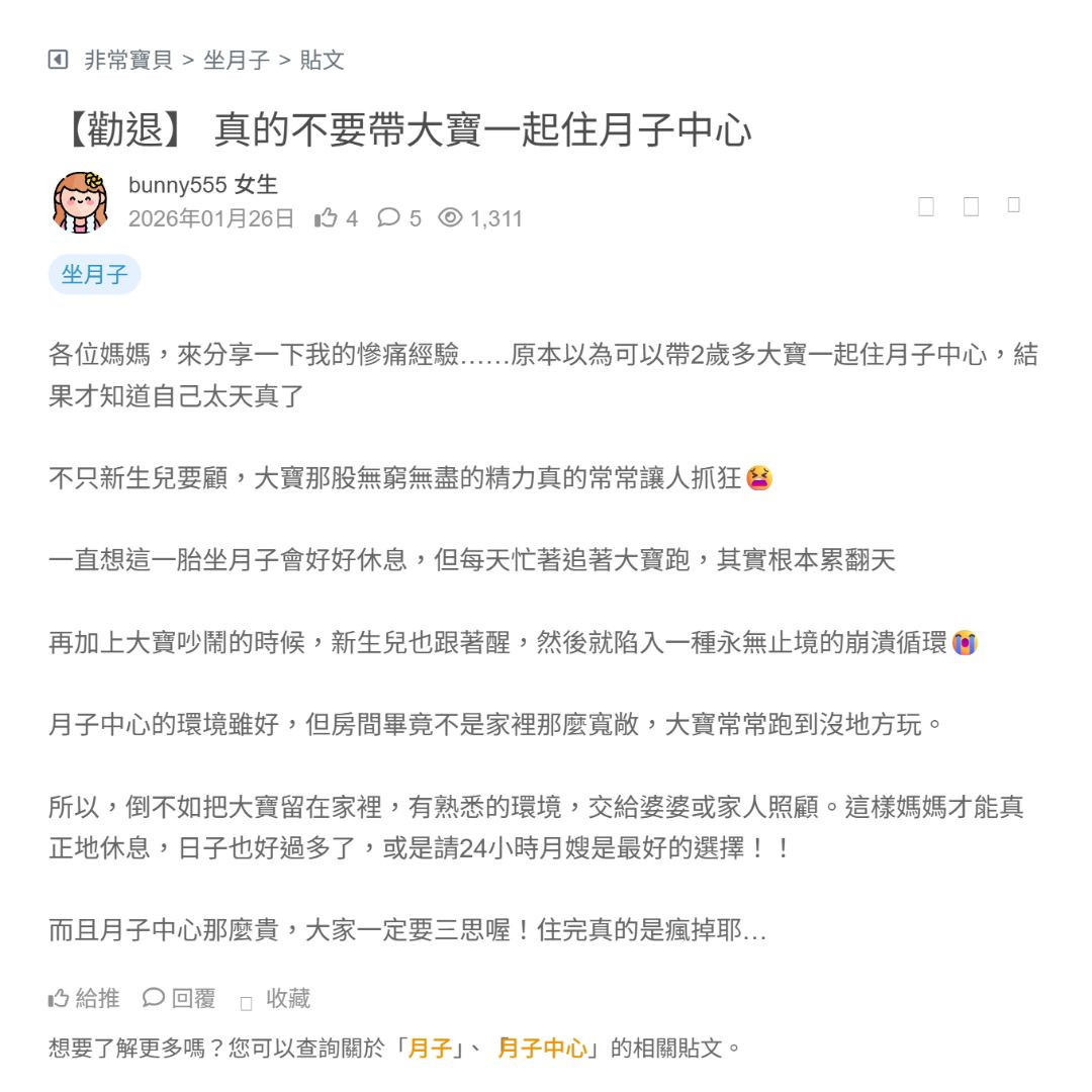 各位媽媽,來分享一下我的慘痛經驗……原本以為可以帶2歲多大寶一起住月子中心,結果才知道自己太天真了