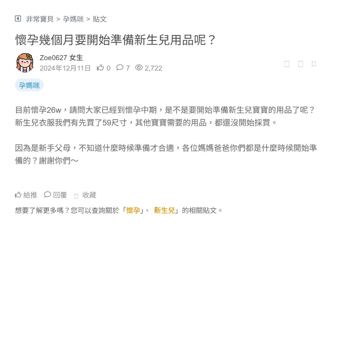 目前懷孕26w,請問大家已經到懷孕中期,是不是要開始準備新生兒寶寶的用品了呢?新生兒衣服我們有先買了59尺寸,其他寶寶需要的用品,都還沒開始採買。