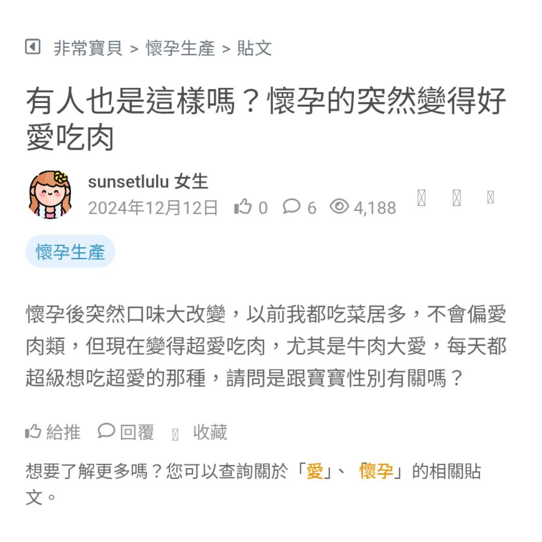 懷孕後突然口味大改變,以前我都吃菜居多,不會偏愛肉類,但現在變得超愛吃肉,尤其是牛肉大愛,每天都超級想吃超愛的那種,請問是跟寶寶性別有關嗎?
