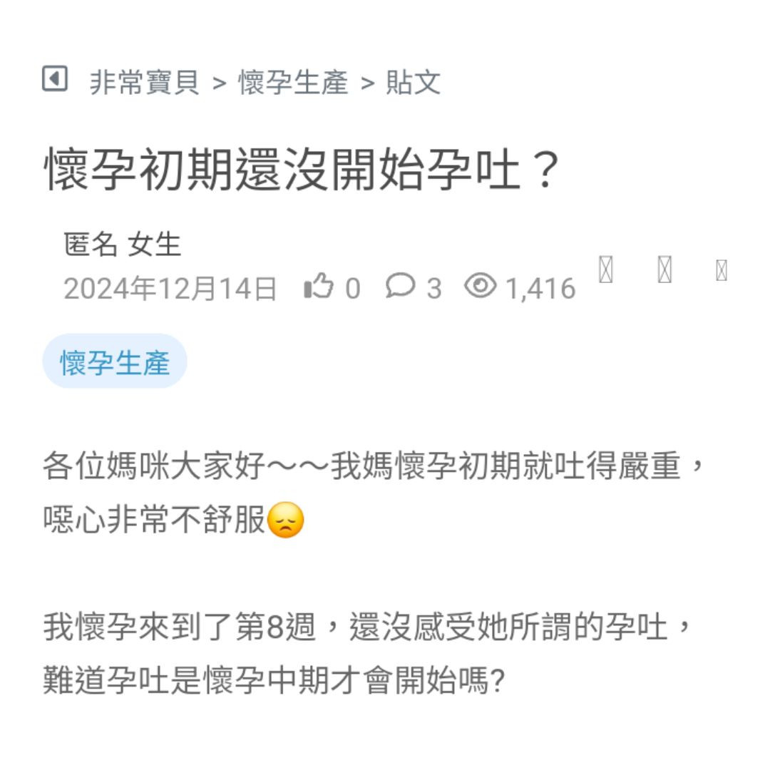 各位媽咪大家好~~我媽懷孕初期就吐得嚴重,噁心非常不舒服😞