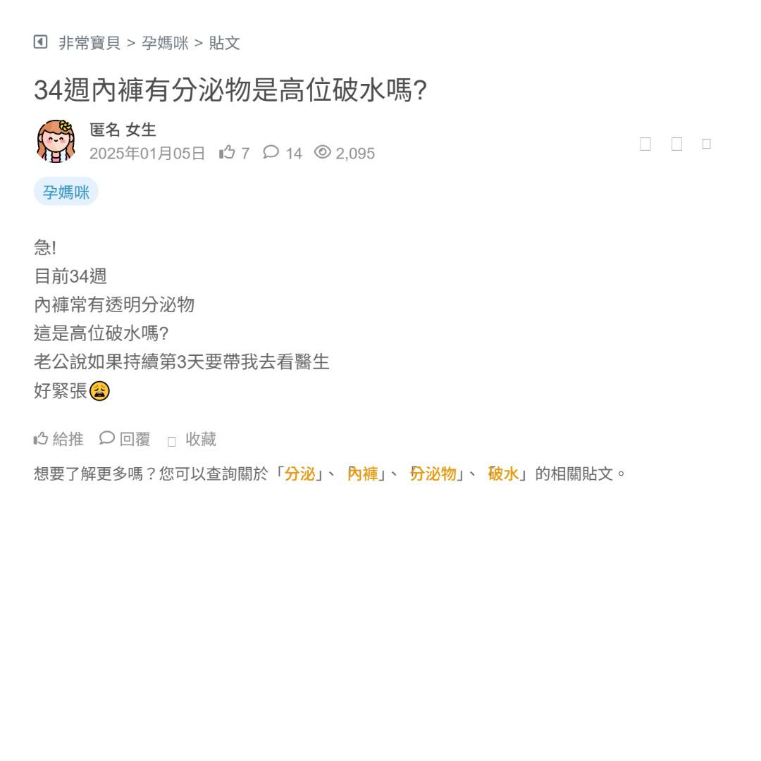 高位破水的確可能是這樣,但也可能只是分泌物變多。建議到醫院用石蕊試紙檢測羊水,這樣比較準確!