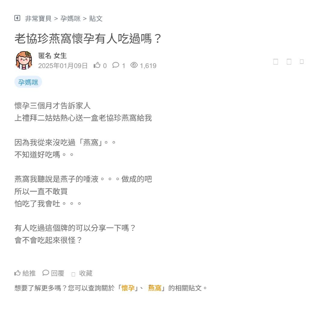 各位媽咪們請問懷孕吃燕窩有用嗎 我懷孕中期想吃試試看 聽說燕窩對孕婦和寶寶都有好處~ 另外有沒有推薦的燕窩品牌 感謝板上媽咪❤️❤️❤️ 看更多