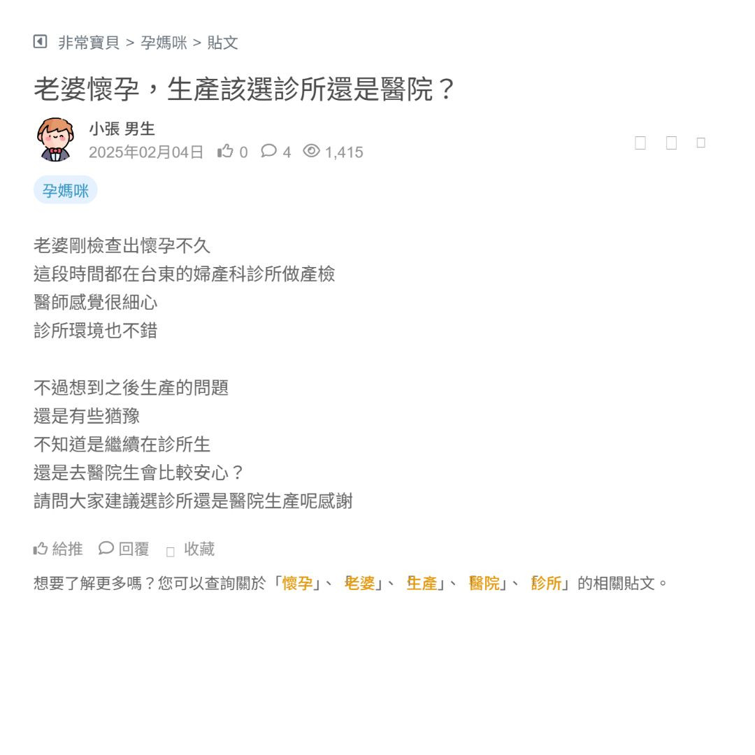 最近開始準備待產,結果一直在糾結到底要去大醫院還是婦產科診所生小孩!!😵💫 大醫院醫療資源比較好,但聽說人超多超忙,護士根本沒時間理產婦(你) 婦產科診所感覺比較溫馨、服務好,但又怕遇到突發狀況會來不及處理…… 各位生過的媽媽們,你們怎麼選的啊?😱 看更多