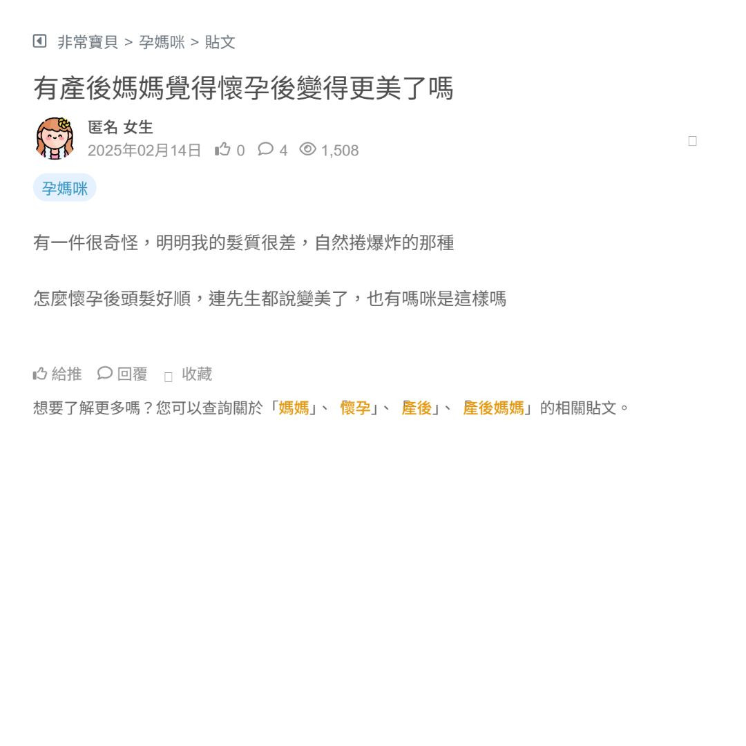 我原本是長髮公主 (自己說?) 懷孕後家人才警告我 產後會嚴重落髮 叫我頭髮不要留太長 去剪一剪也沒差 反正之後都會掉一堆頭髮 撿到你忘記自己 我很怕會產後...