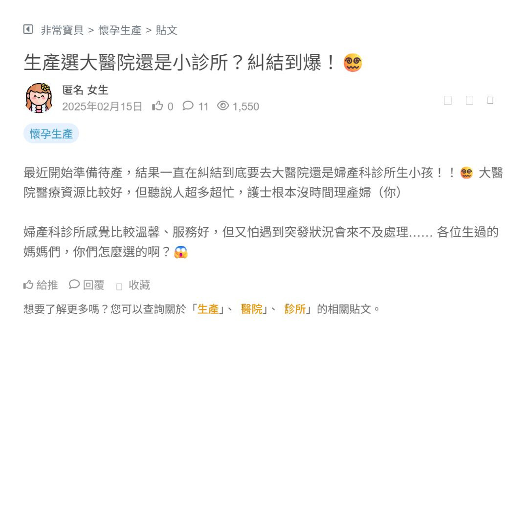 最近開始準備待產,結果一直在糾結到底要去大醫院還是婦產科診所生小孩!!😵💫 大醫院醫療資源比較好,但聽說人超多超忙,護士根本沒時間理產婦(你)