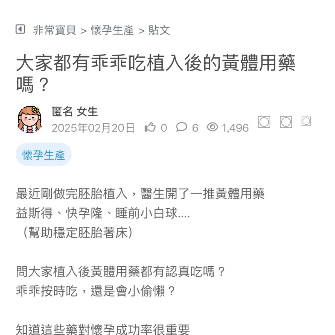 大家都有乖乖吃植入後的黃體用藥嗎?