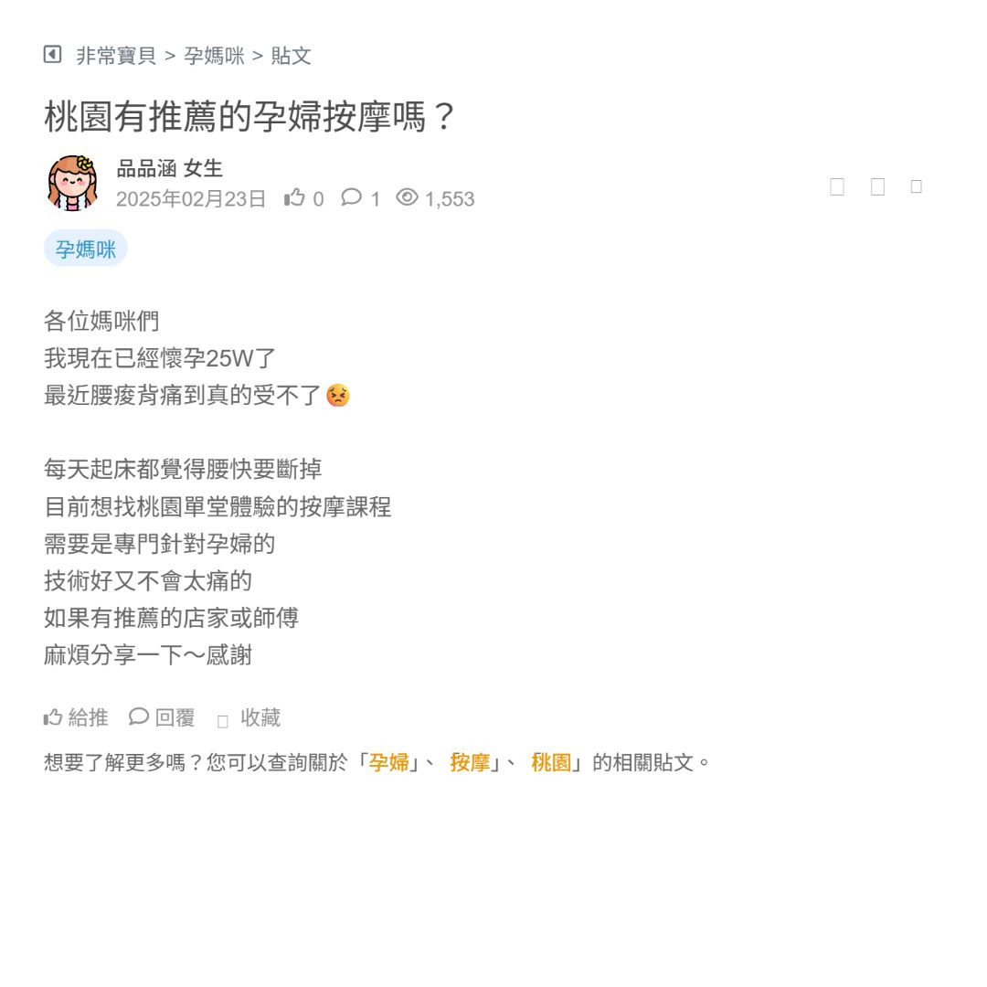 目前懷孕5個多月快6個月了 最近覺得腰痠背痛、腿腫手麻,真的很需要放鬆一下🥲 想找桃園區有提供孕婦按摩的店家或工作室,求推薦! 位置在桃園市區、中壢、八德...