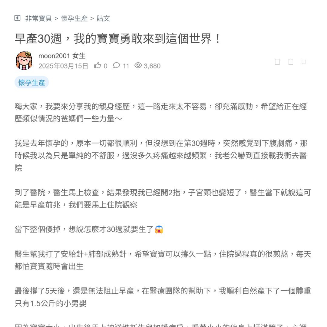 最後撐了5天後,還是無法阻止早產,在醫療團隊的幫助下,我順利自然產下了一個體重只有1.5公斤的小男嬰