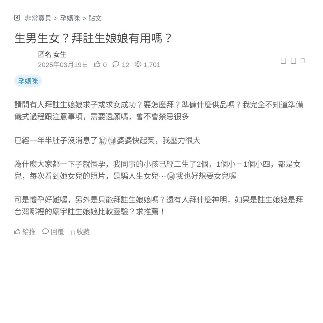 可是懷孕好難喔,另外是只能拜註生娘娘嗎?還有人拜什麼神明,如果是註生娘娘是拜台灣哪裡的廟宇註生娘娘比較靈驗?求推薦!