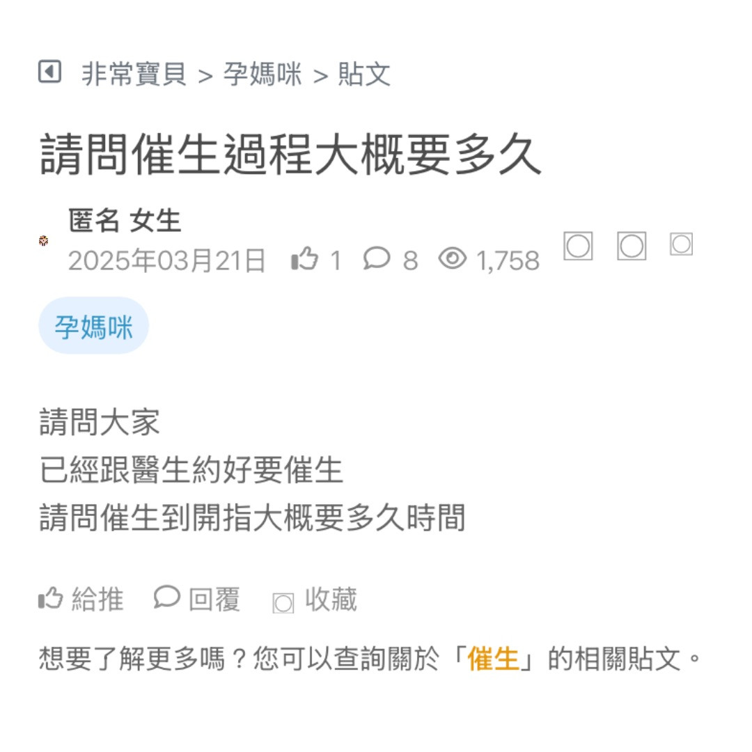 請問催生到開指大概要多久時間