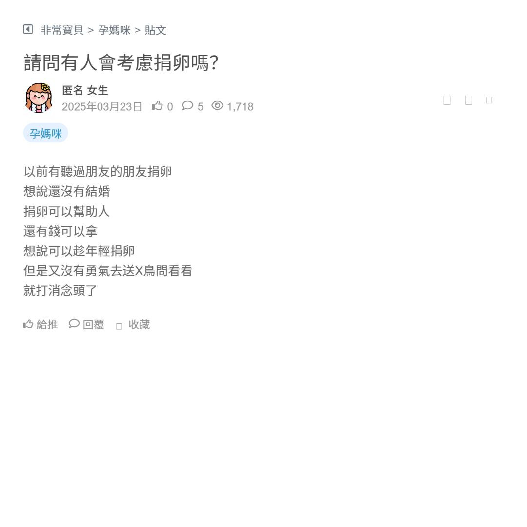 請益台北生殖中心有沒有推薦女性凍卵的地方、細心的醫生,今年許願想要完成這個人生大事🥹 看更多