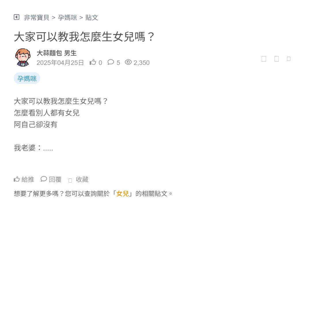 自從超音波檢查發現我生的是兒子 我生的不是女兒 而是兒子我老公就好不開心一直在煩我為什麼不生女兒⋯⋯ 不就1/2 乾 我哪能決定要不要生的性別??
