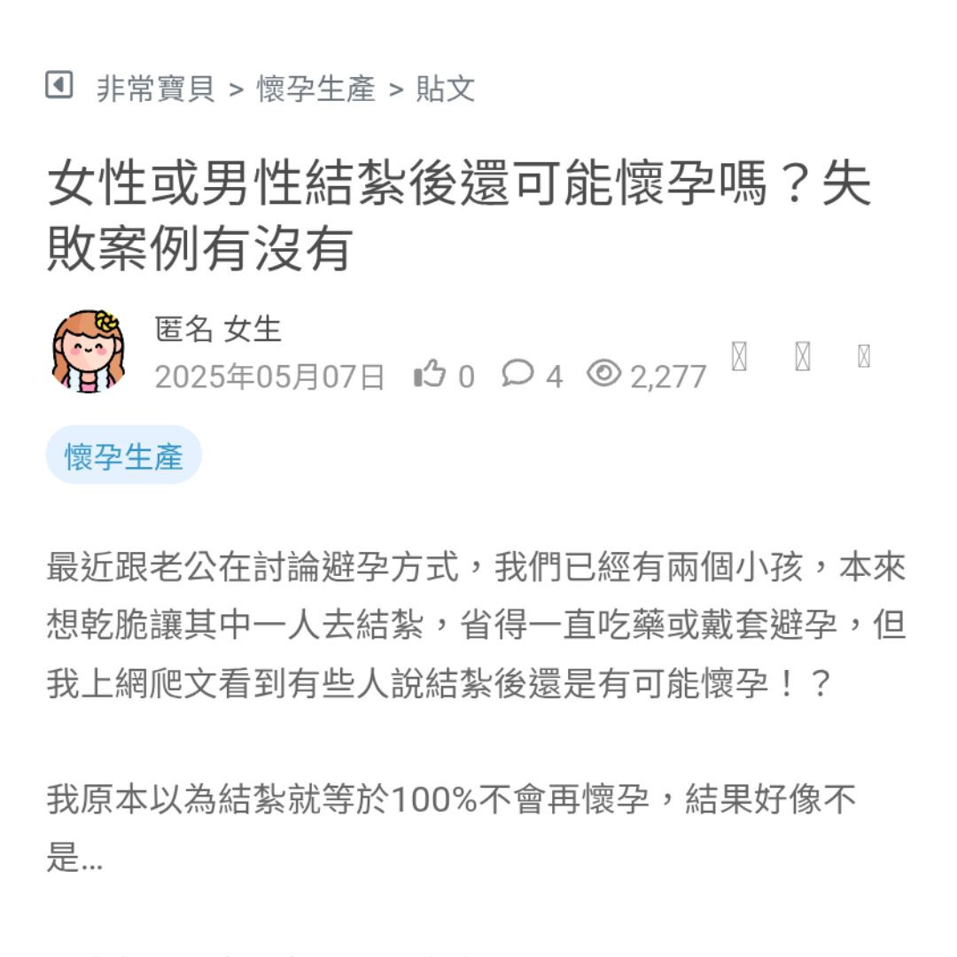 我原本以為結紮就等於100%不會再懷孕,結果好像不是…
