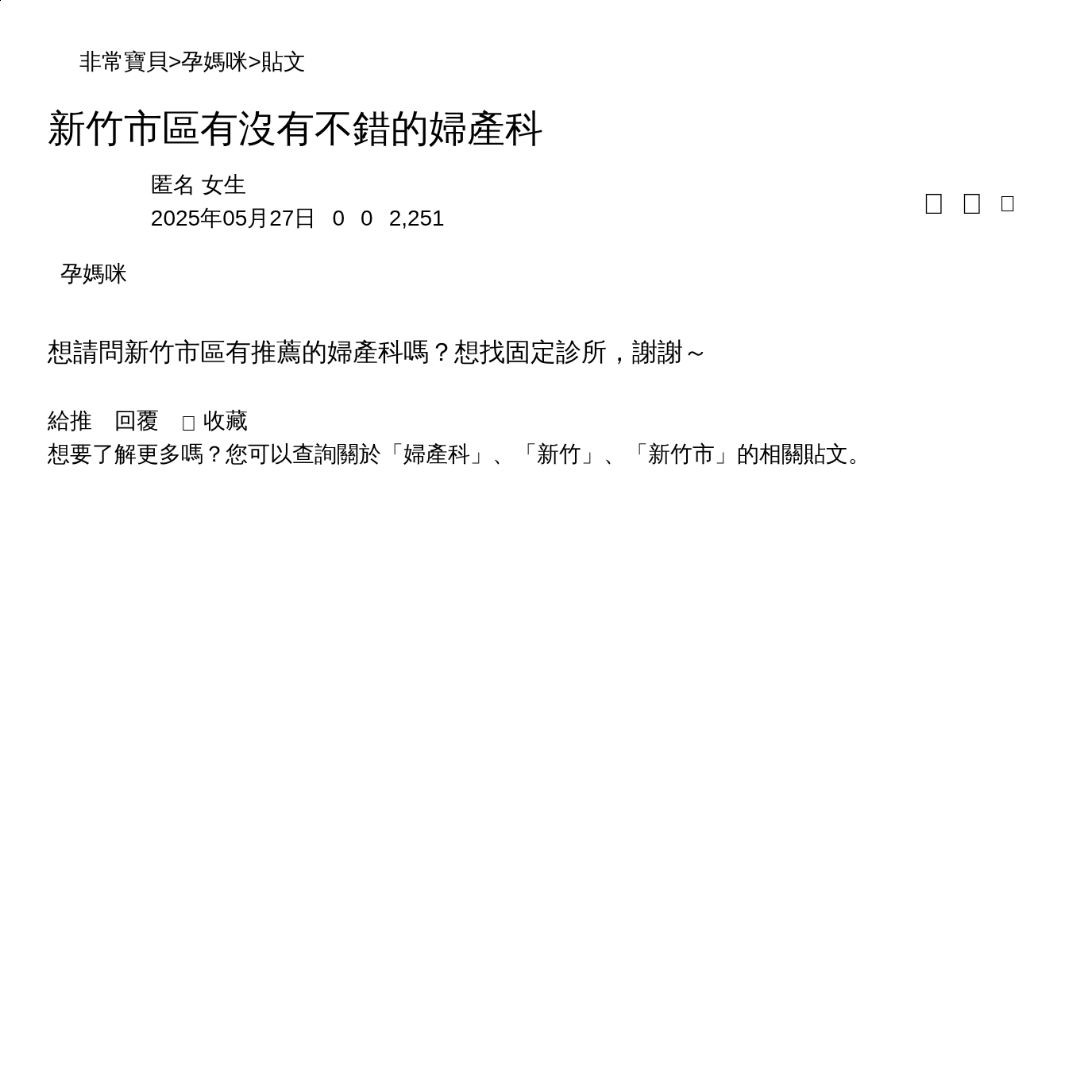 想請問新竹市區有推薦的婦產科嗎?想找固定診所,謝謝~