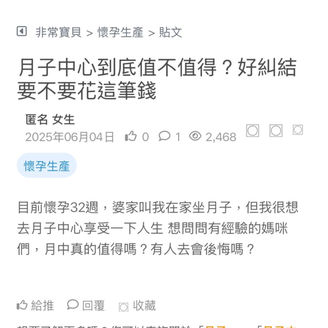 目前懷孕32週,婆家叫我在家坐月子,但我很想去月子中心享受一下人生 想問問有經驗的媽咪們,月中真的值得嗎?有人去會後悔嗎?