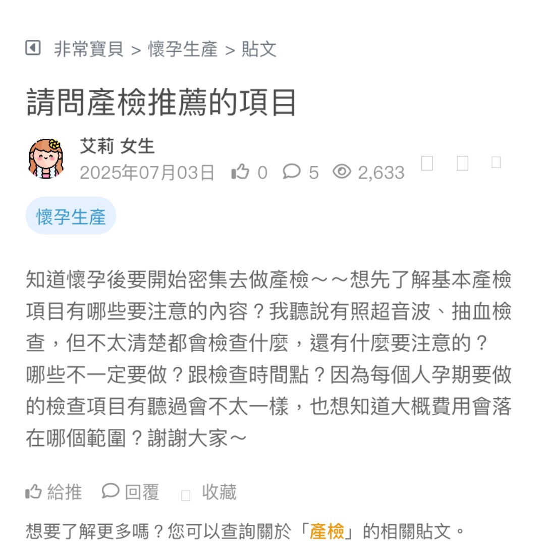 我是第一次懷孕,整個過程對我來說都是全新的體驗,也有很多緊張和期待。因為自己嫁到香港去,所以大部分檢查都是照醫生的安排來做,但我也會上網查很多資料,想確認每一個步驟是不是有跟上。回想這一路,從懷孕前到後期,每一個檢查都讓我覺得自己和寶寶更靠近一點,也更有安全感。這篇文章主要是給在香港居住的台灣孕媽媽... 看更多