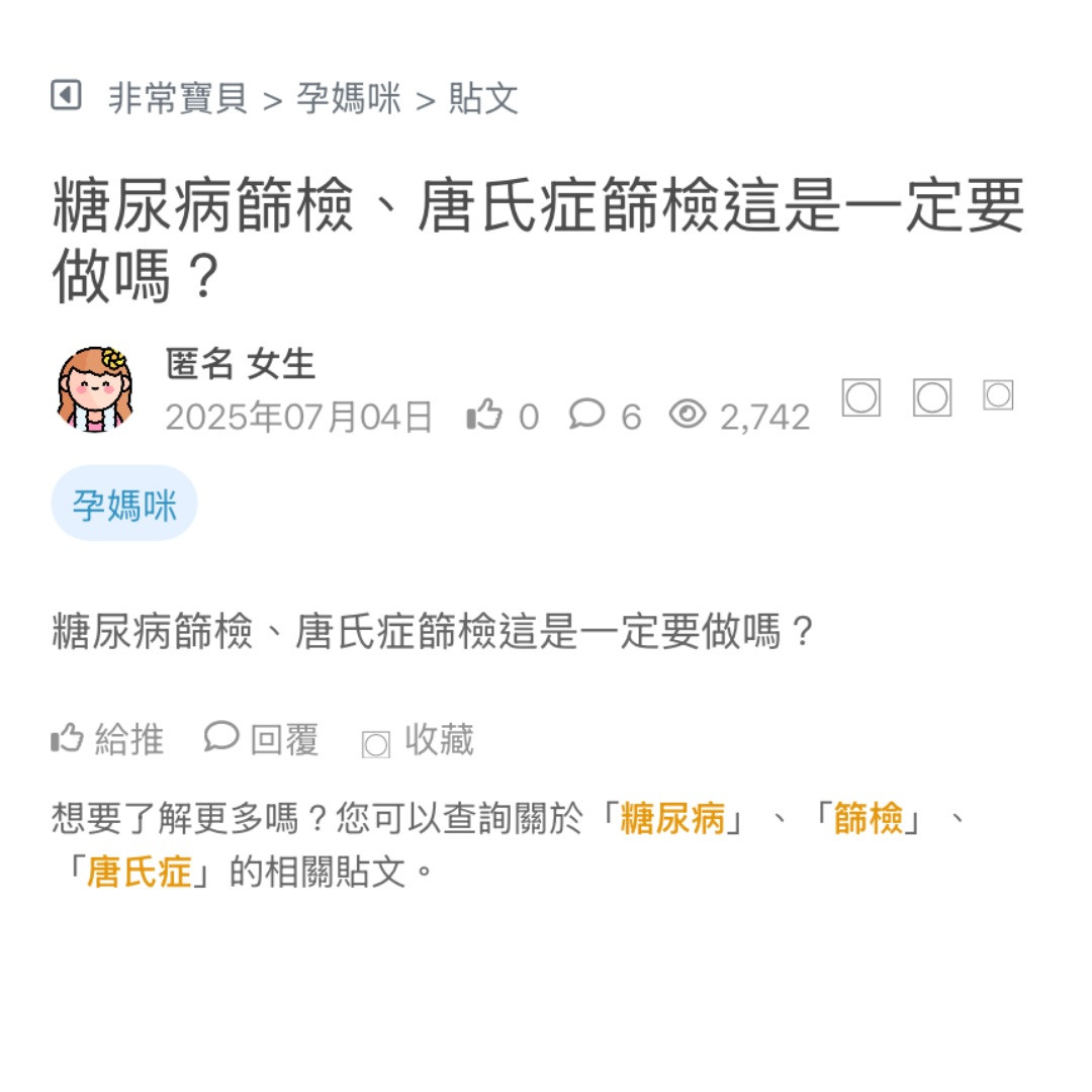 糖尿病篩檢、唐氏症篩檢這是一定要做嗎?