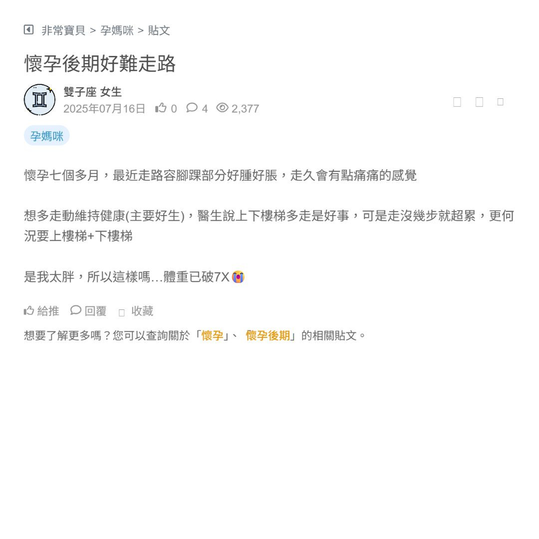 我體重增加快12公斤 已經來到孕後期 31週 二週前腳覺得有點怪怪的 (就是走路跟以前觸地板的感覺不同 但也沒去注意 然後上禮拜六我要出去 一看我的腳變得好腫 然...