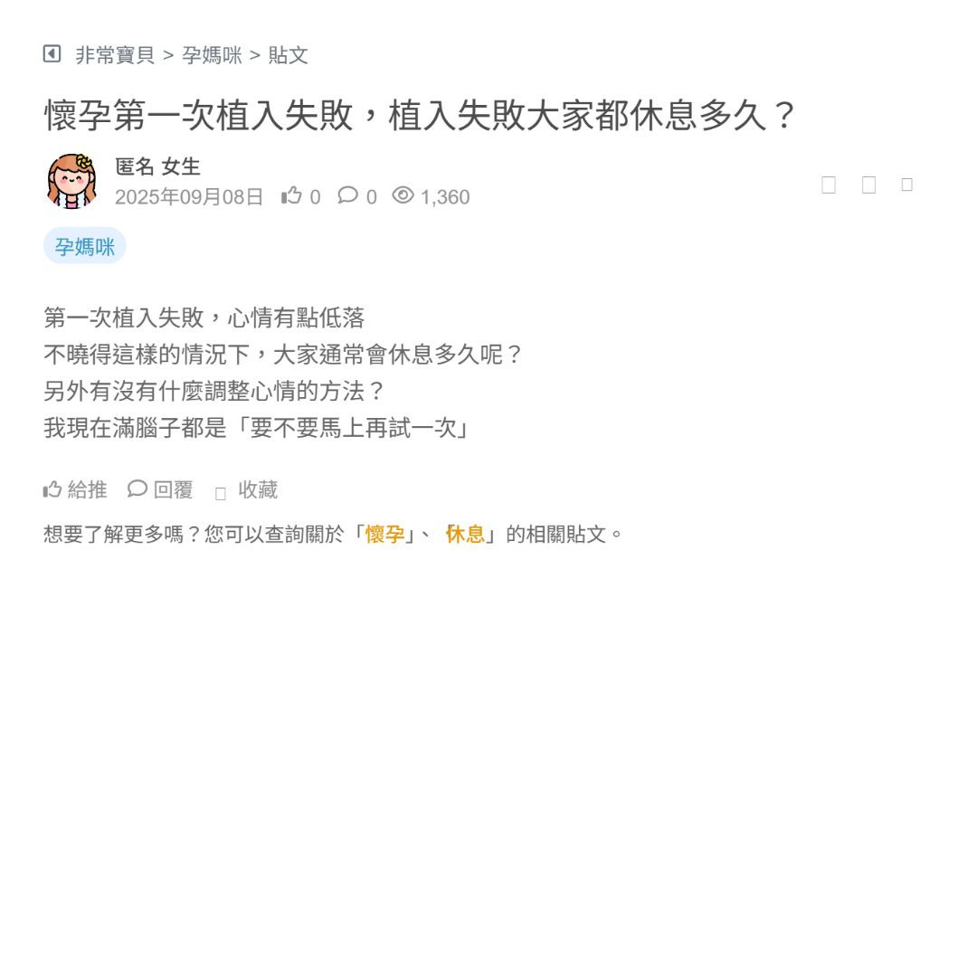 試管又失敗了 真的很難過 怎麼會又失敗... 大家失敗還會再想嘗試嗎?? 要這樣一直試下去嗎 看更多
