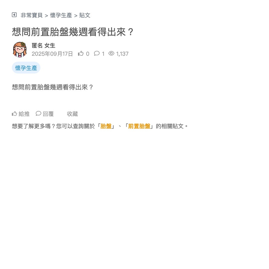 目前懷孕35w2d 27週產檢寶寶一直是頭下腳上的姿勢 但到了31週 醫生告知他變成頭上腳下 然後每次產檢都是錯誤姿勢 老實說 我很想嘗試自然產不想開刀 但醫生建議如果38週前還沒轉正 可能就要考慮剖腹產 這段時間我試了各種方法 但昨天產檢還是臀位... 我真的想自然產 看更多