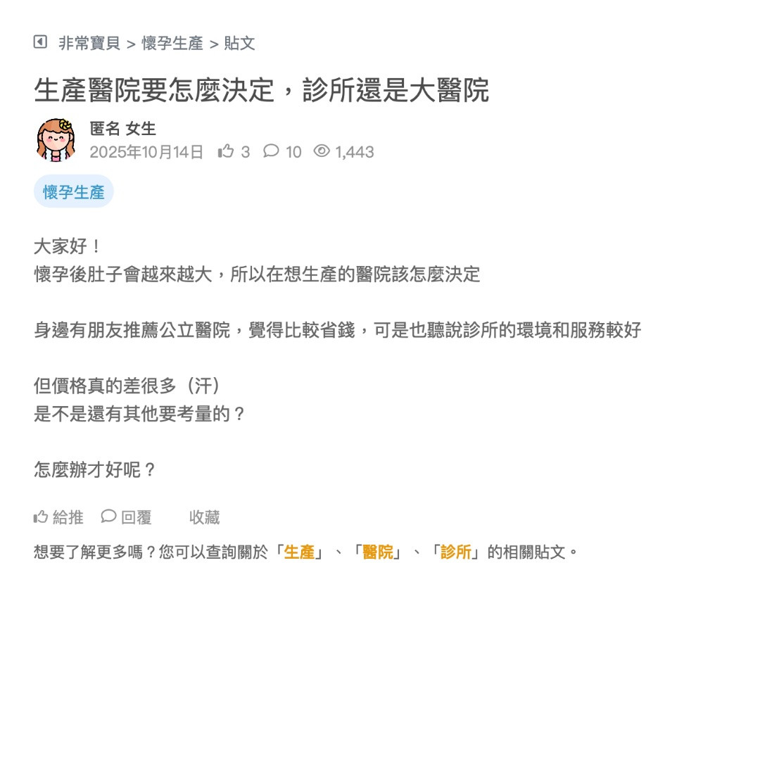 最近開始準備待產,結果一直在糾結到底要去大醫院還是婦產科診所生小孩!!😵💫 大醫院醫療資源比較好,但聽說人超多超忙,護士根本沒時間理產婦(你) 婦產科診所感覺比較溫馨、服務好,但又怕遇到突發狀況會來不及處理…… 各位生過的媽媽們,你們怎麼選的啊?😱 看更多