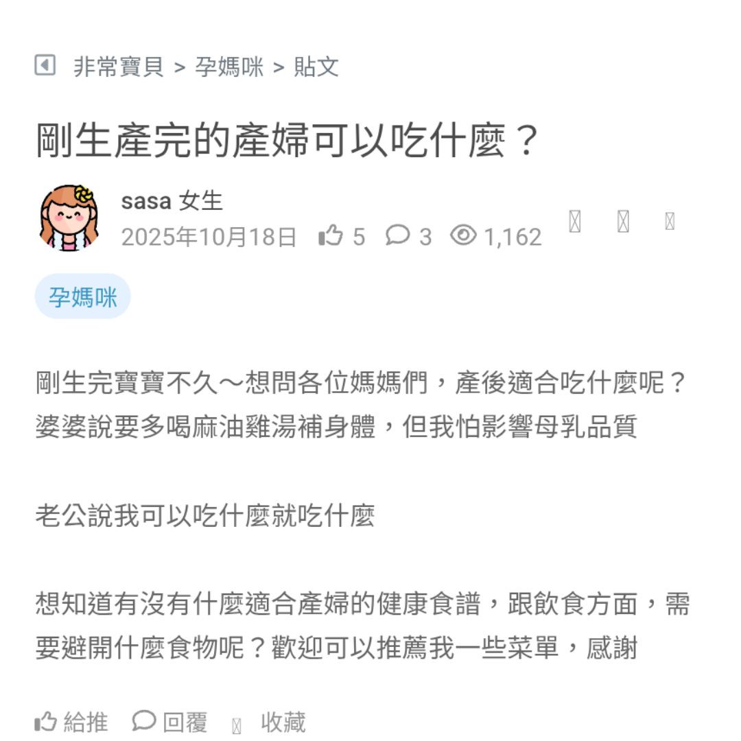 剛生完寶寶不久~想問各位媽媽們,產後適合吃什麼呢?婆婆說要多喝麻油雞湯補身體,但我怕影響母乳品質