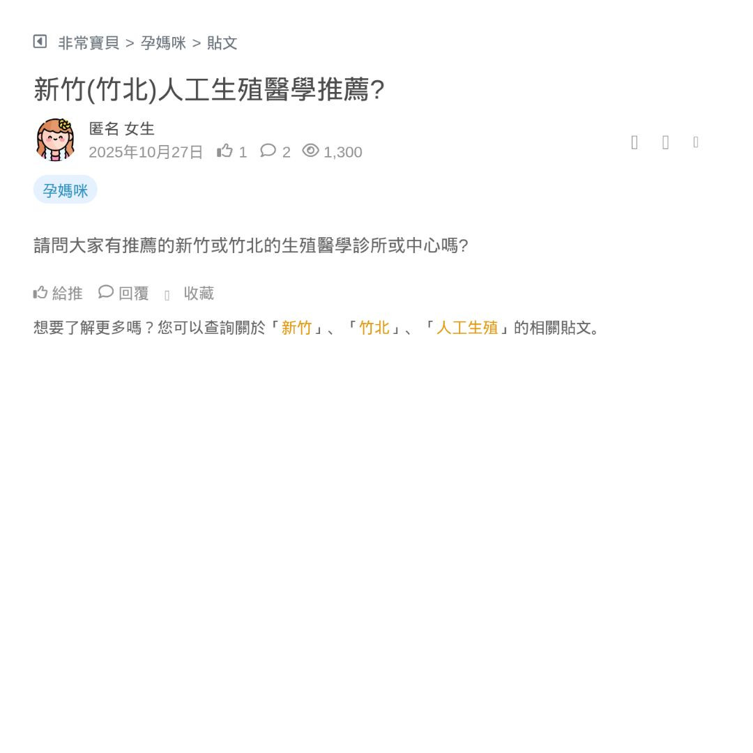 請問大家有推薦的新竹或竹北的生殖醫學診所或中心嗎?
