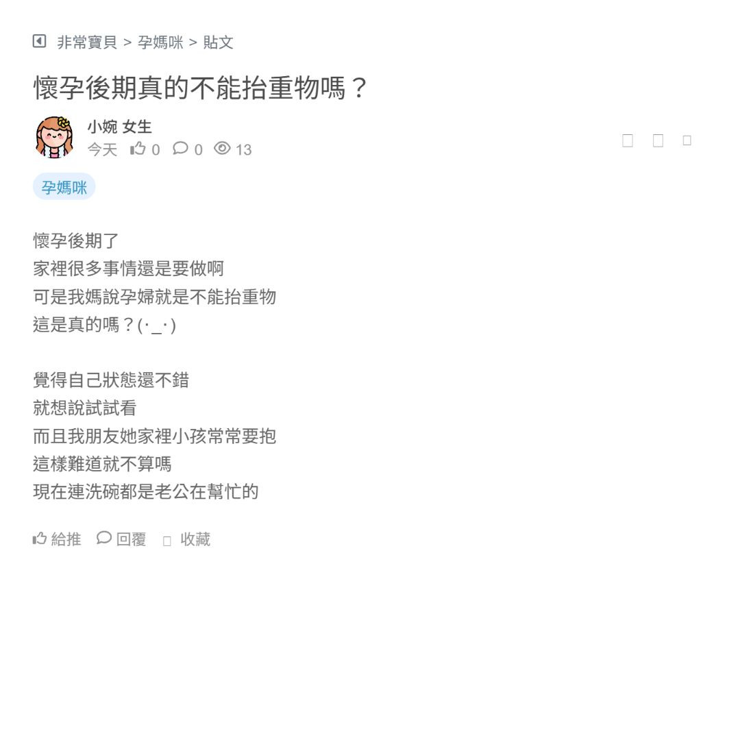 我老公至從我懷孕後開始不耐煩 叫他幫我拿東西(主要是包裹很重)他就不想幫我去拿 一件事情要講好幾次 別人都是說懷孕不要墊腳尖 他曬衣服也不想幫 我自己要墊腳尖去把衣服曬完 難道我還要挺大肚子自己去拿餐拿包裹嗎? 看更多
