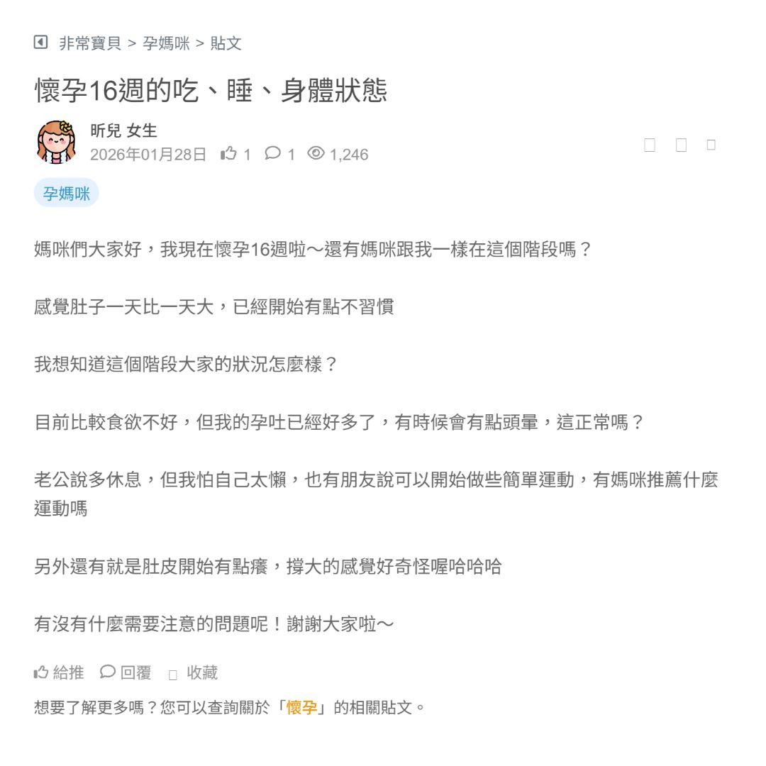 媽咪們大家好,我現在懷孕16週啦~還有媽咪跟我一樣在這個階段嗎?