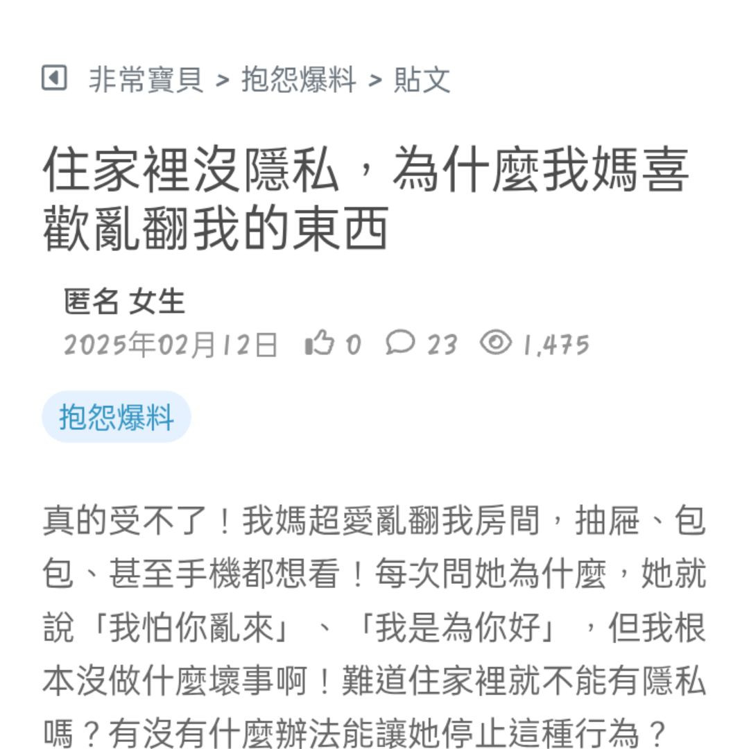 真的受不了!我媽超愛亂翻我房間,抽屜、包包、甚至手機都想看!每次問她為什麼,她就說「我怕你亂來」、「我是為你好」,但我根本沒做什麼壞事啊!難道住家裡就不能有隱私嗎?有沒有什麼辦法能讓她停止這種行為?