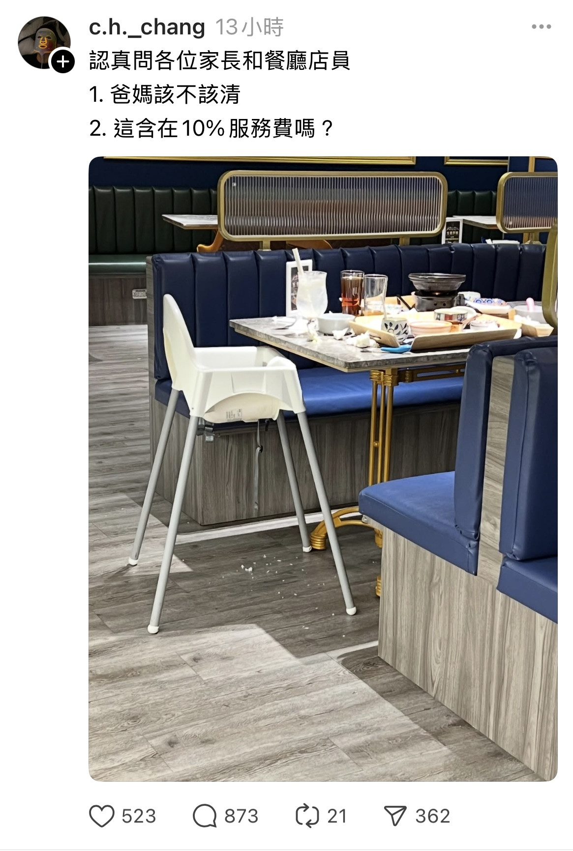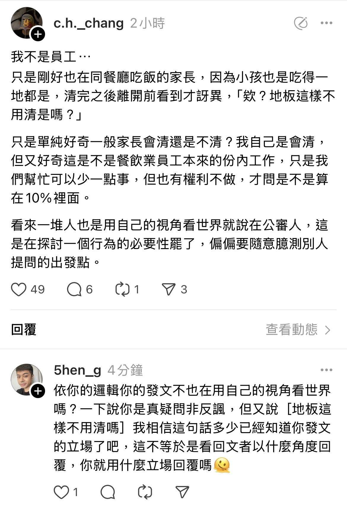 在網路上看到一個網友在問 如果帶小孩出門去餐廳吃飯 兒童餐椅跟地上很髒 很亂 大人會清理嗎 結果下面一堆人在罵她 其實活該誰叫她在滿是仇恨小孩的脆/threads...