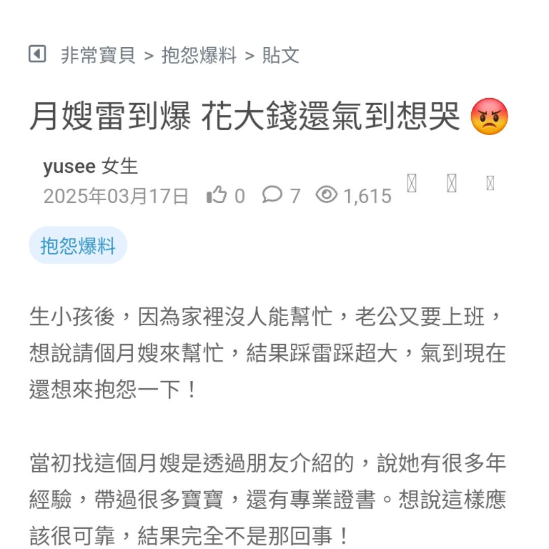 生小孩後,因為家裡沒人能幫忙,老公又要上班,想說請個月嫂來幫忙,結果踩雷踩超大,氣到現在還想來抱怨一下!