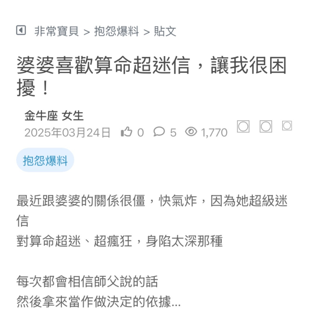 最近跟婆婆的關係很僵,快氣炸,因為她超級迷信