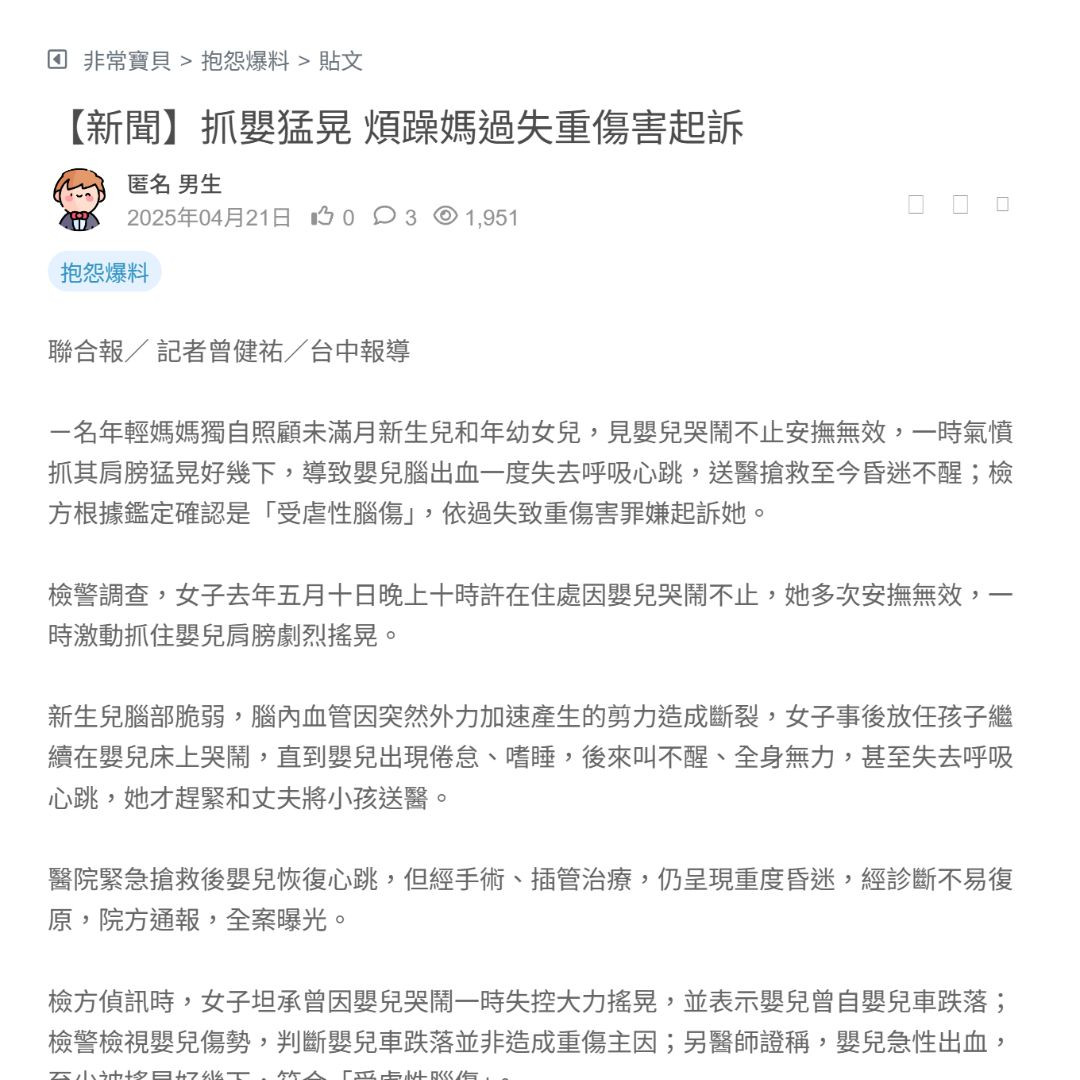 ㄧ名年輕媽媽獨自照顧未滿月新生兒和年幼女兒,見嬰兒哭鬧不止安撫無效,一時氣憤抓其肩膀猛晃好幾下,導致嬰兒腦出血一度失去呼吸心跳,送醫搶救至今昏迷不醒;檢方根據鑑定確認是「受虐性腦傷」,依過失致重傷害罪嫌起訴她。