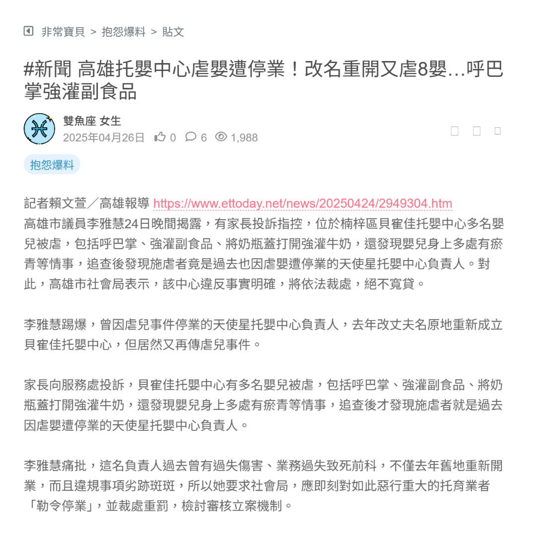 #新聞 高雄托嬰中心虐嬰遭停業!改名重開又虐8嬰…呼巴掌強灌副食品