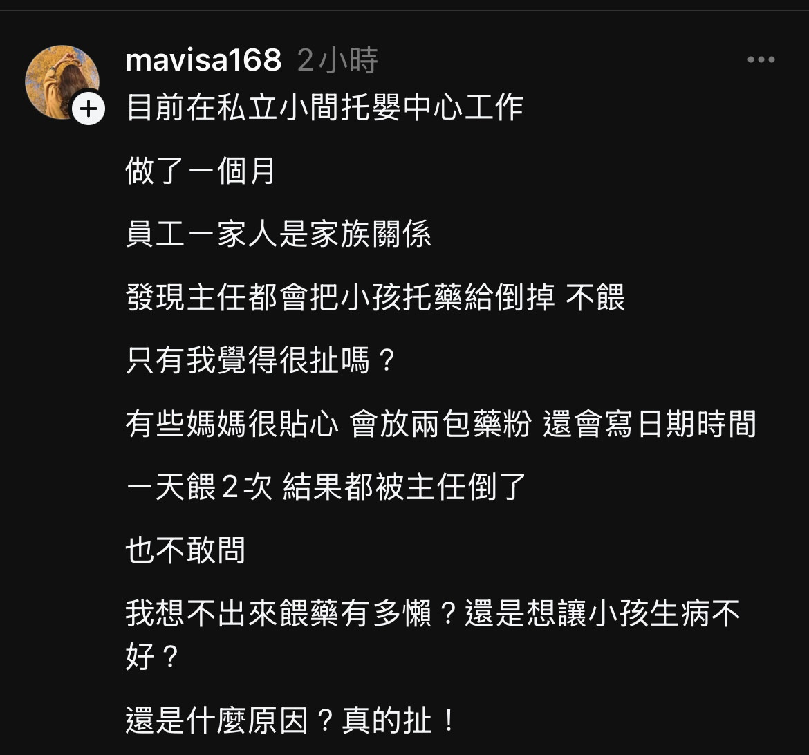 我自己真的不會想到托嬰老師不餵藥這件事、如果是幼兒園我也想不到